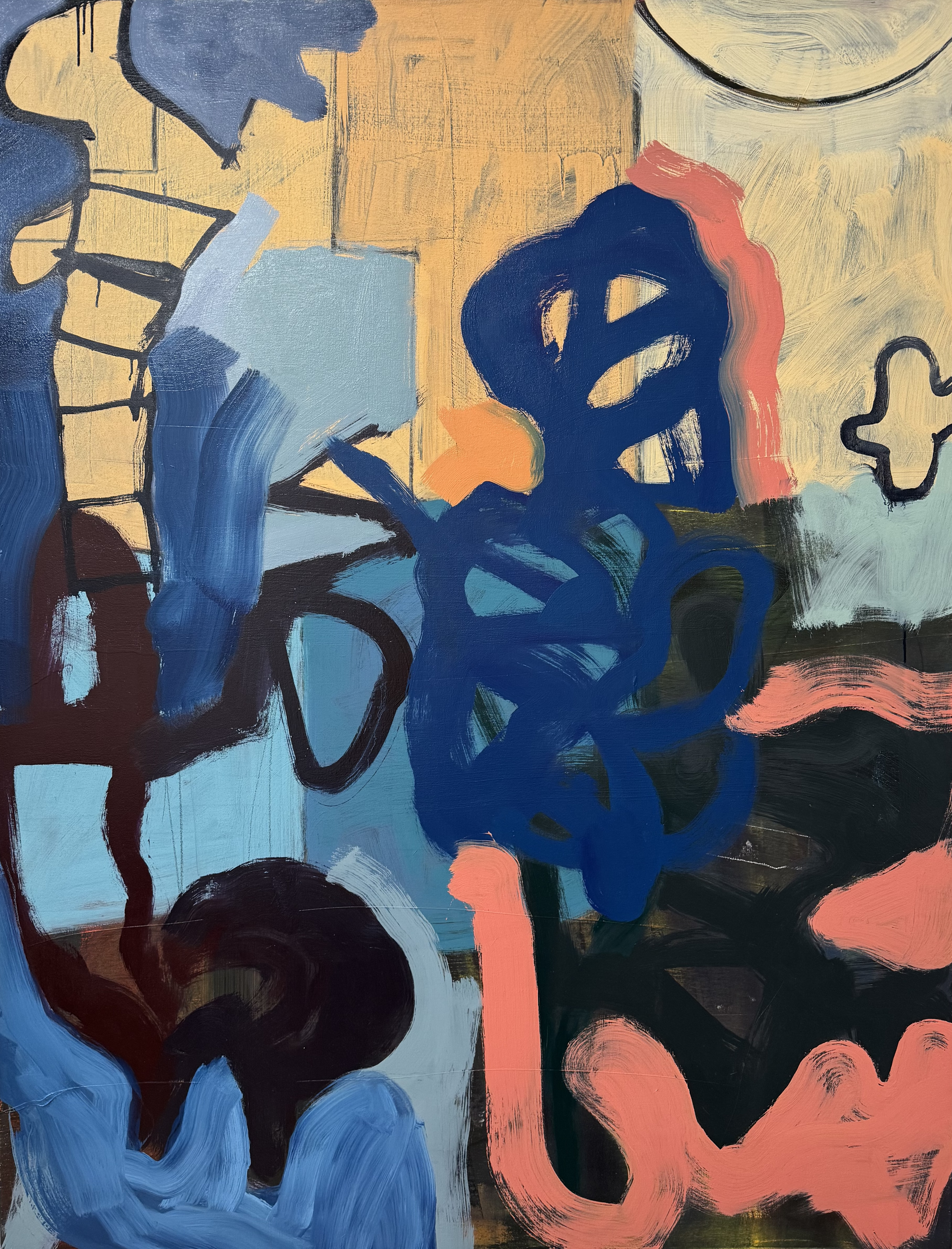 peter crow makes large, abstract paintings of bright colors, swirling movement, and descending forms that traverse the surface playing with depth and shallow space, texture and smoothness, ambiguity and representation.