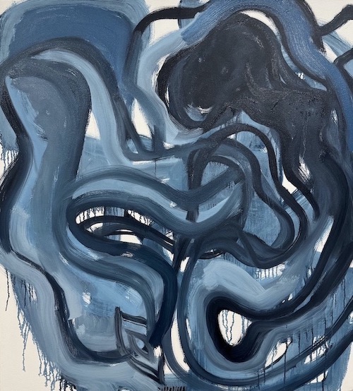 For a long time, I had been attracted to the idea of painting with just two colors, black and white. Maybe it was when I first saw one of de Kooning’s black and white paintings from the 40s, in a catalog reproduction. I didn’t see one of the originals until I saw Painting, 1948, at the Museum of Modern Art when I was a graduate student. I felt a deep emotional connection between de Kooning’s line, Ingres’s portrait drawings, and the act of drawing itself. Then there was the color, black, and its tug on my sensibilities. My father, the painter, had long made black painted silhouettes of figures, nudes in interiors, figures acting out in cityscapes with many other figures.
