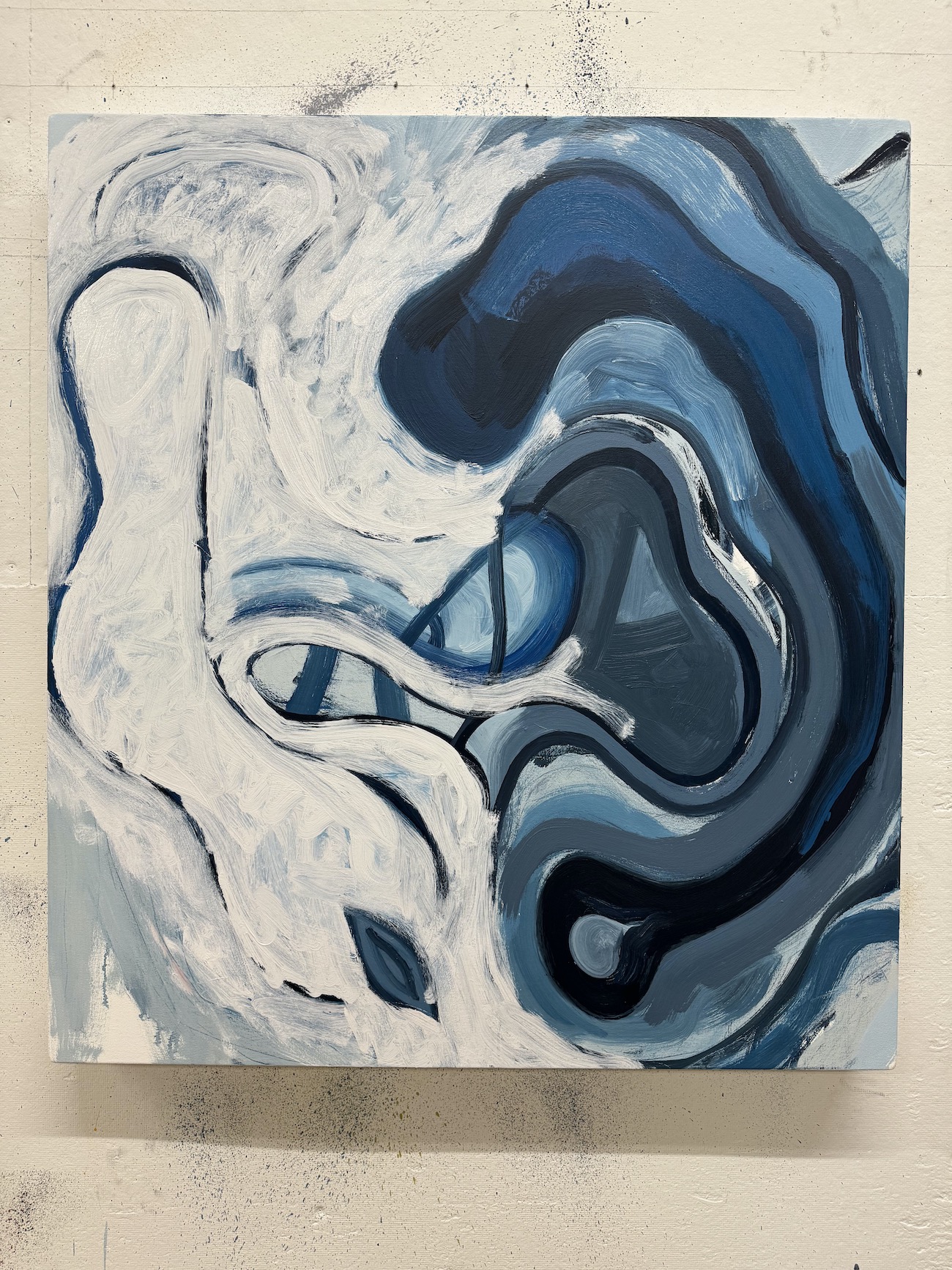 On August 25 of this year, I began this painting taking shapes and ideas from a recent painting. My idea was to keep it simple; the small size saw to that. There were just two or three shapes, and three or four, colors. To fit the shapes within the small size I rotated and placed them together, so that one shape was devouring the other. The limited colors are white, Payne’s gray, and warm and cool blue. Drawing has always been important to me, an essential means of communicating ideas. I think that part of the reason for using a limited palette is to at least maintain the fiction that what one is doing is different than drawing.